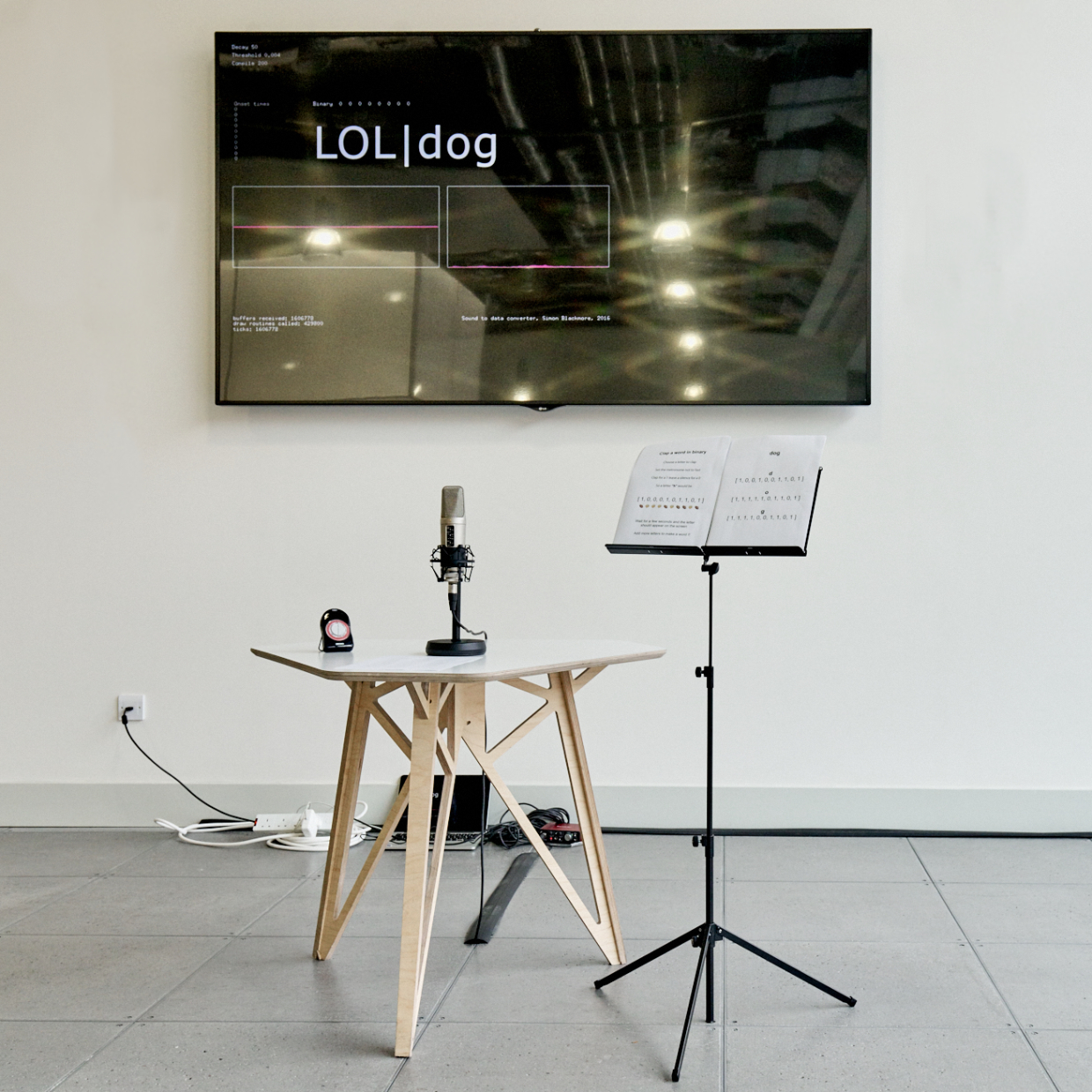 The aim of this piece was to create a simple but rhythmically demanding interactive system whereby people could create text on a screen by clapping binary patterns. I was interested in presenting an installation that was both accessible but also had some challenge to it.