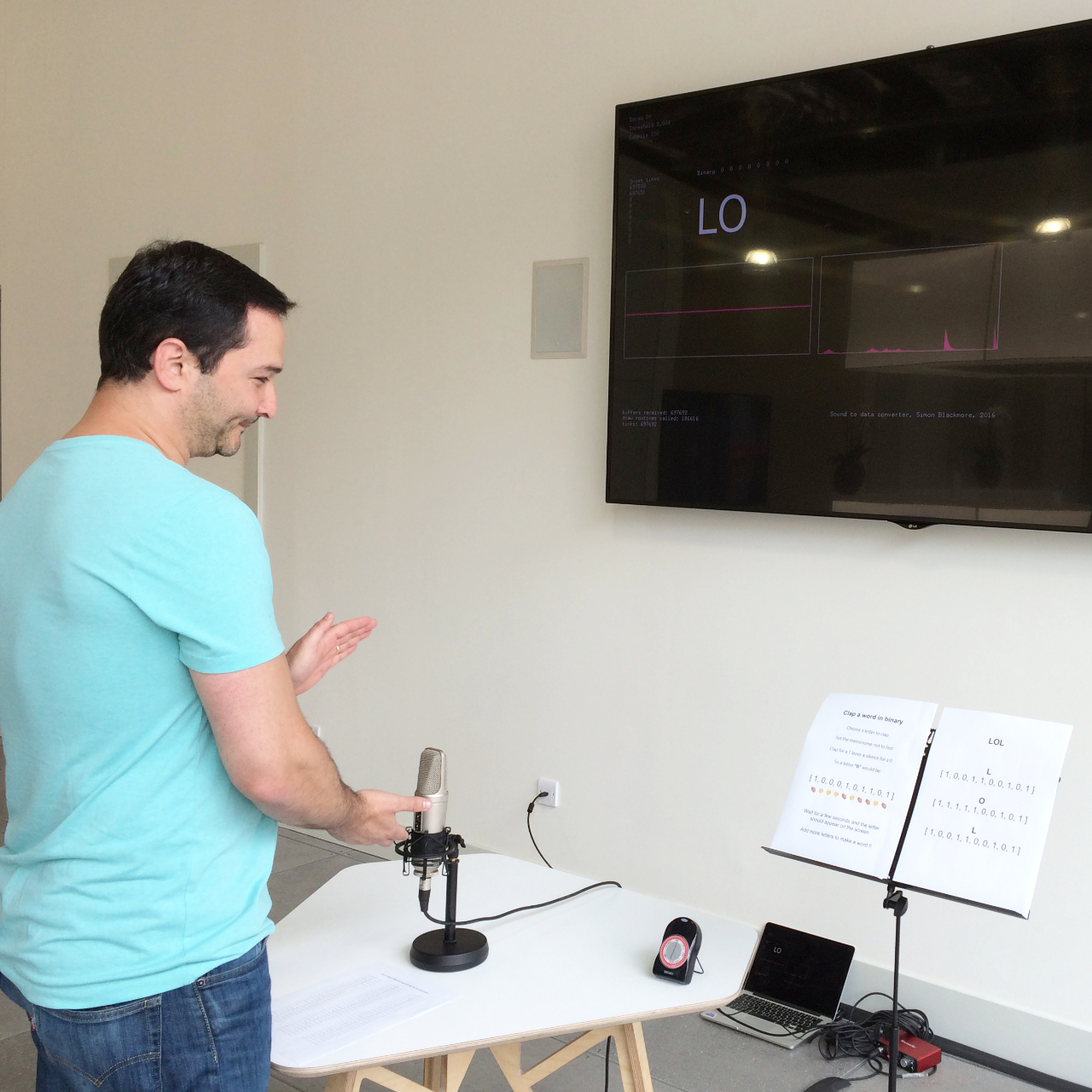 To realise the piece, I developed software that interpreted how an asynchronous serial port connection works. A microphone was connected to a Raspberry Pi using Focusrite Scarlett Solo USB Audio Interface. I wrote software in OpenFrameworks to detect peaks in the audio. If the amplitude of a signal reached a predefined amount the time was stored in an array. If there were no peaks detected after a certain amount of time, the software calculated the time between the claps to create a letter. This asynchronous system allowed participants to change the tempo on the metronome or even have a go without the metronome.