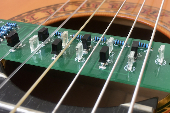 One approach to sensing the vibration of each string on a nylon strung guitar is to use a piezo-based system such those as developed by RMC. Unfortunately this involves some considerable modification to the instrument including drilling holes and changing the saddle slot. Therefore, I developed a way to do this based on infrared optical sensors. This method can create separate signals from each string. Whilst the sound quality is inferior to a piezo system it works sufficiently for note detection and can be used without permanent modification to a guitar. The system is in early development but below are some images and schematics of the circuit made in EAGLE.